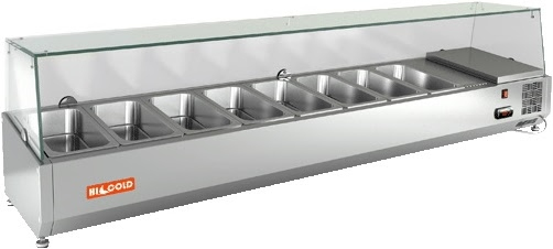 Настольная холодильная витрина HICOLD VRTG 1835 1/4 к PZ3 предназначена для охлаждения, кратковременного хранения и демонстрации ингредиентов, салатов и готовых блюд на предприятиях общественного питания и торговли. Устанавливается на холодильные столы для пиццы PZ3 (для монтажа предусмотрены специальные крепления в нижней части корпуса).