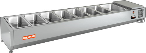 Настольная холодильная витрина HICOLD VRTO 1835 1/3 к PZ3 предназначена для охлаждения, кратковременного хранения и демонстрации ингредиентов, салатов и готовых блюд на предприятиях общественного питания и торговли. Устанавливается на холодильные столы для пиццы PZ3 (для монтажа предусмотрены специальные крепления в нижней части корпуса).