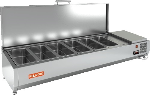 Настольная холодильная витрина HICOLD VRTU 1390 1/4 предназначена для охлаждения, кратковременного хранения и демонстрации ингредиентов, салатов и готовых блюд на предприятиях общественного питания и торговли.