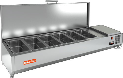 Настольная холодильная витрина HICOLD VRTU 1525 1/4 к PZE4 предназначена для охлаждения, кратковременного хранения и демонстрации ингредиентов, салатов и готовых блюд на предприятиях общественного питания и торговли. Устанавливается на холодильные столы для пиццы PZE4 (для монтажа предусмотрены специальные крепления в нижней части корпуса).