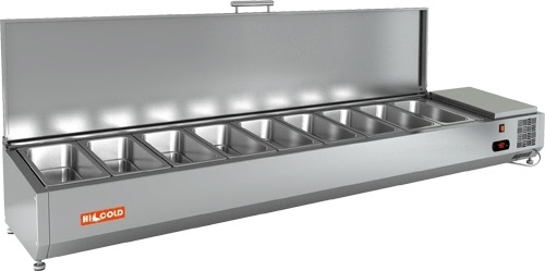 Настольная холодильная витрина HICOLD VRTU 2010 1/3 к PZE4 предназначена для охлаждения, кратковременного хранения и демонстрации ингредиентов, салатов и готовых блюд на предприятиях общественного питания и торговли. Устанавливается на холодильные столы для пиццы PZE4 (для монтажа предусмотрены специальные крепления в нижней части корпуса).