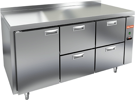 Оснащён легкозаменяемыми магнитными уплотнителями. Имеет ящики и распашную дверь с автоматическими доводчиками и фиксатором открытого положения. Регулируемые по высоте ножки гарантируют устойчивость на неровной поверхности и позволяют подстраивать высоту оборудования под текущие потребности. Изготовлен из нержавеющей стали.