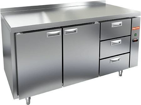 Оснащён легкозаменяемыми магнитными уплотнителями. Имеет ящики и распашные двери с автоматическими доводчиками и фиксатором открытого положения. Регулируемые по высоте ножки гарантируют устойчивость на неровной поверхности и позволяют подстраивать высоту оборудования под текущие потребности. Изготовлен из нержавеющей стали.